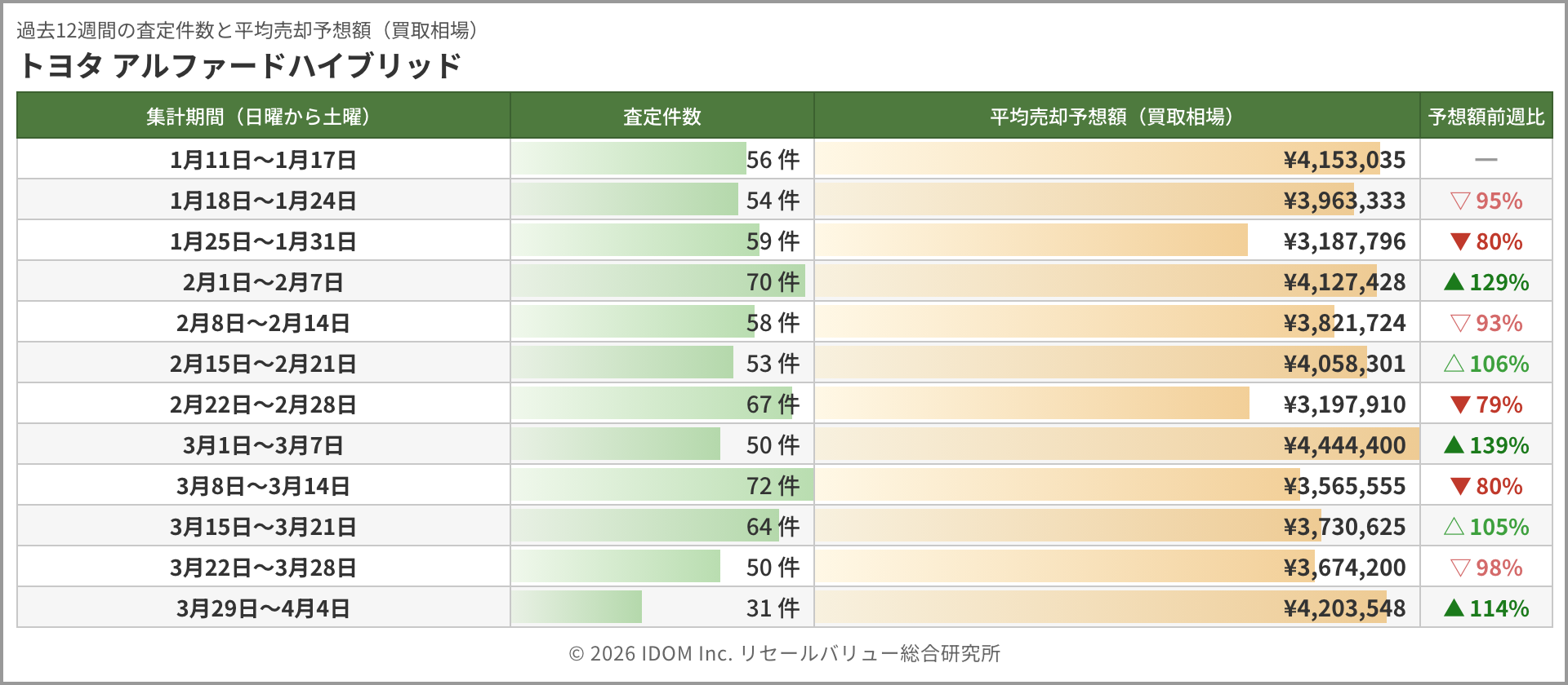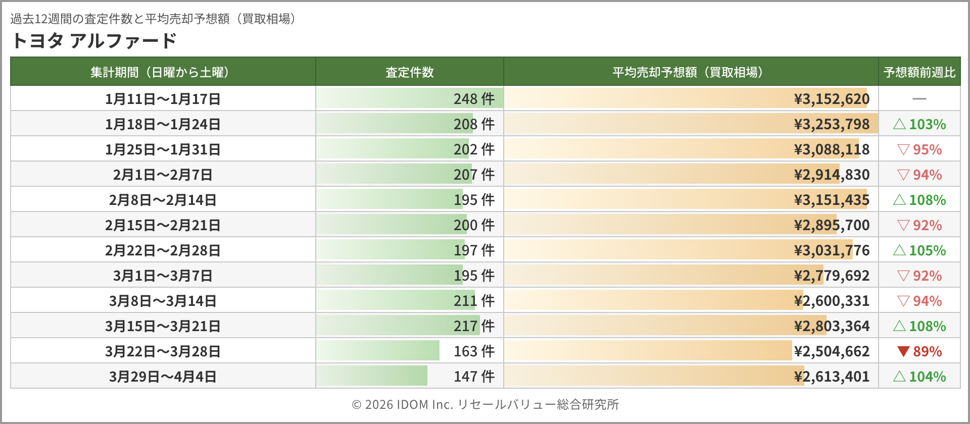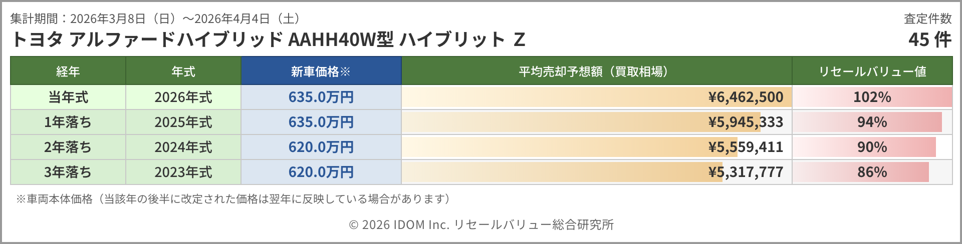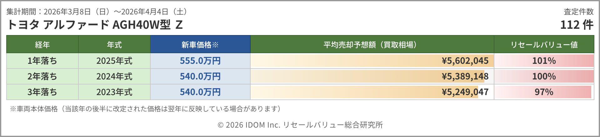 今週のアルファード相場 2026年4月4日(土)集計:トヨタ アルファードの売却予想額(買取相場)リセールバリュー速報