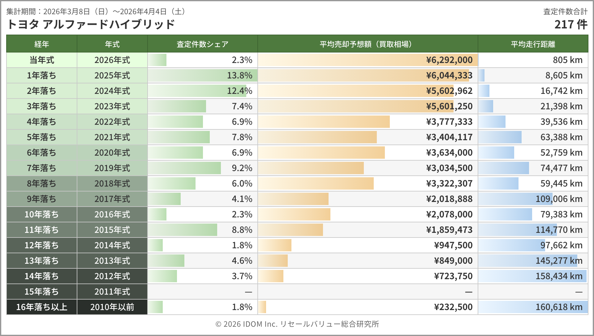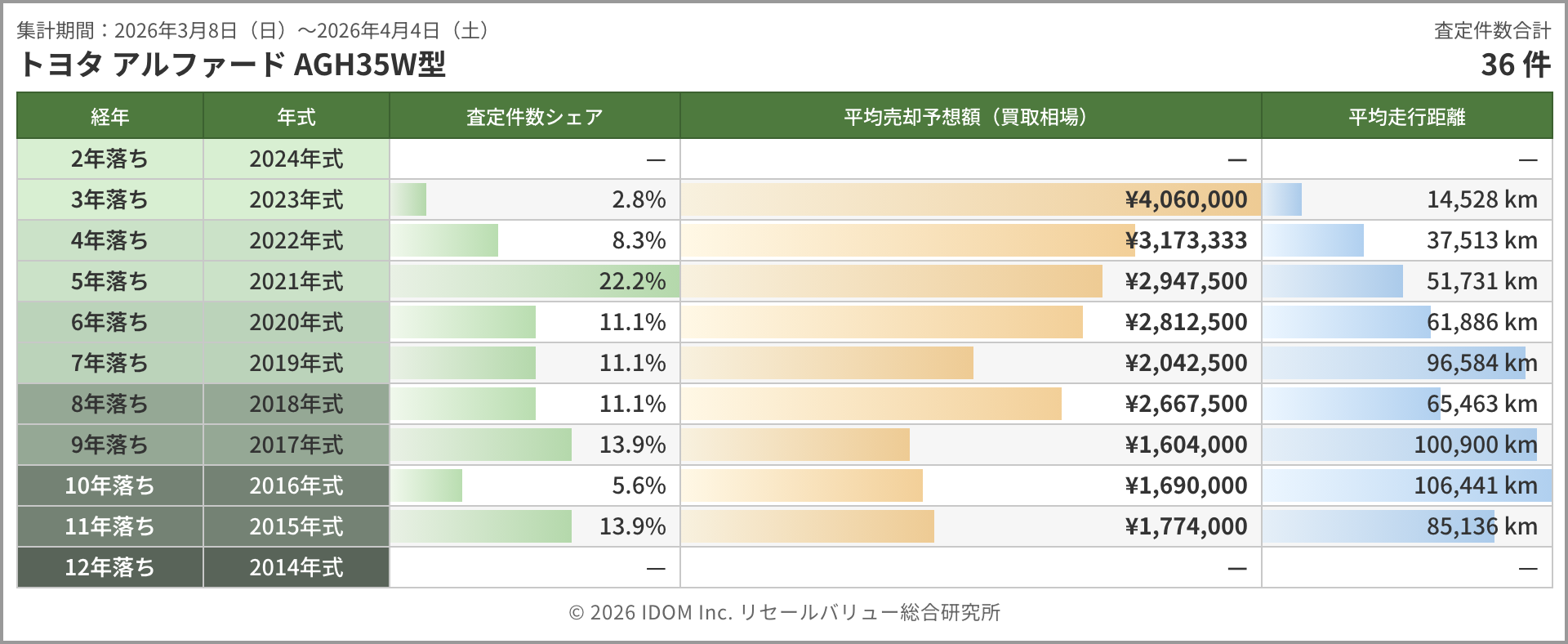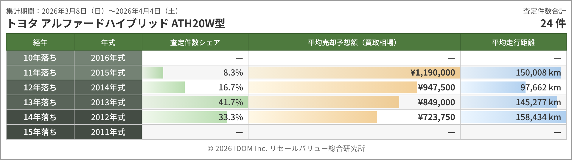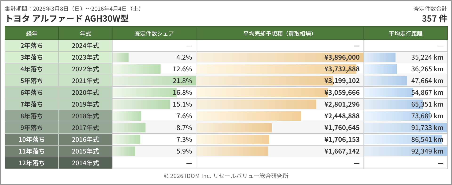 主力のAGH30W型は357件。3年落ち約390万円(約7万円の下落)、4年落ち約373万円(約7万円の下落)と高年式帯は前回と同じペースで値を下げた。5年落ちは約320万円(約3万円の下落)と下げ幅が縮小し、6年落ち約306万円(約3万円の上昇)、8年落ち約245万円(約2万円の上昇)と中間帯で持ち直しの動きが見られる。9〜11年落ちは170万円台の横ばいが続いており、海外輸出需要が下支えする底値圏にあると言えるだろう。