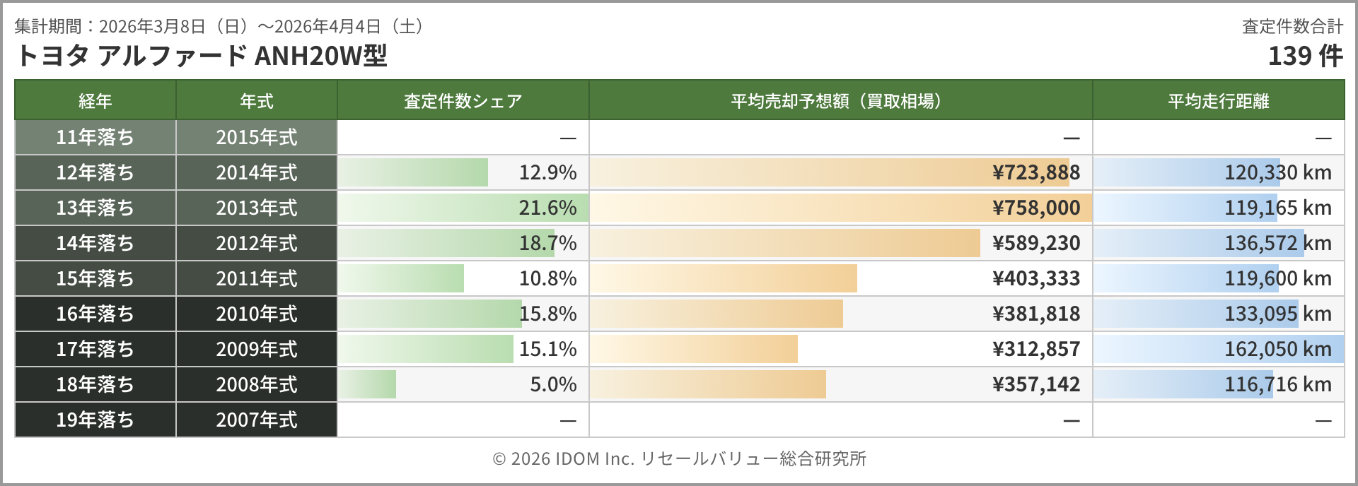 ANH20W型は139件。12年落ちが約72万円(約4万円の下落)となった一方、13年落ちは約76万円(約4万円の上昇)と前回から逆転し、12年落ちを上回った。13年落ちは件数シェア21.6%と最大で、引き合いの根強さがうかがえる。15〜16年落ちは38万〜40万円台で横ばいを維持しており、この価格帯での下値は固まった状態が続いている。