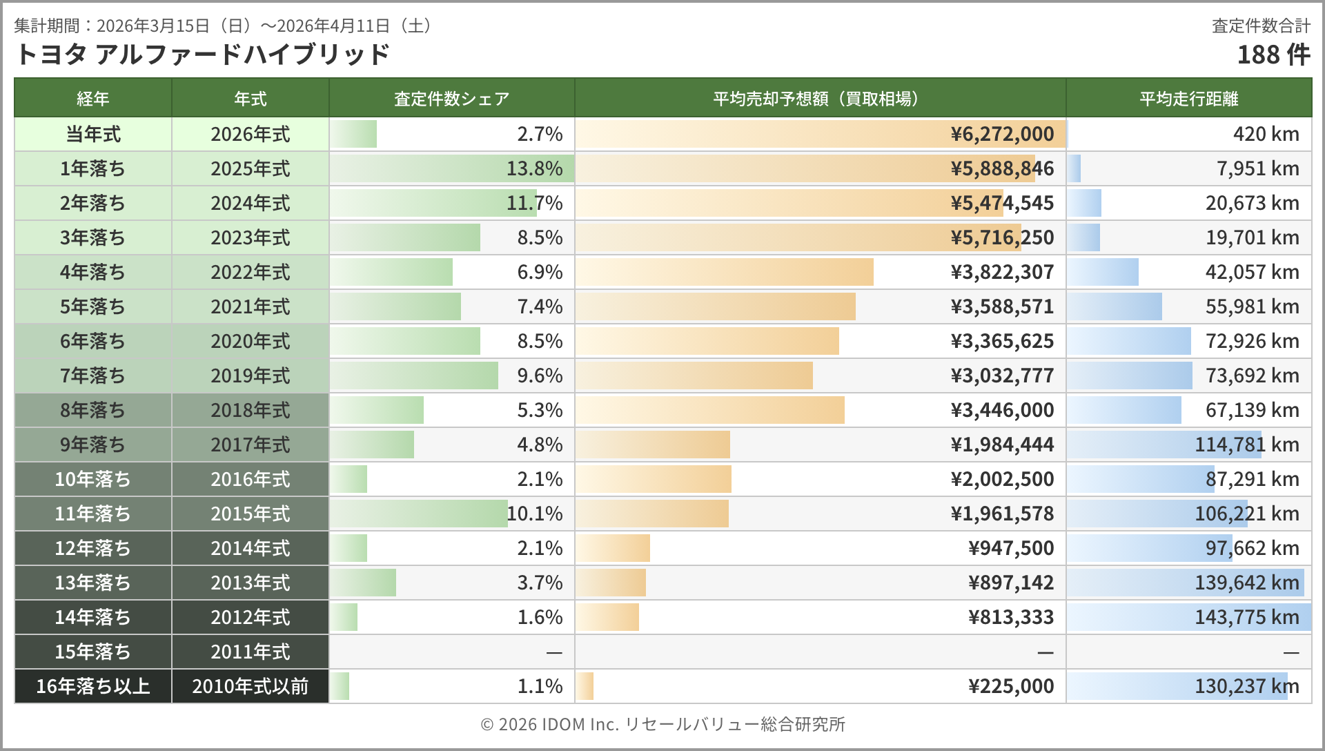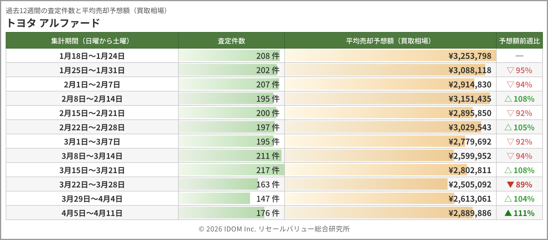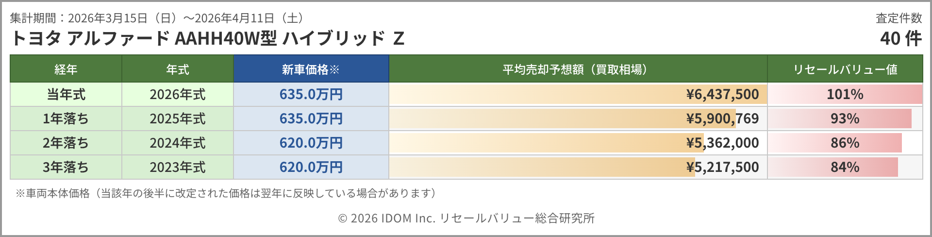 今週のアルファード相場 2026年4月11日(土)集計:トヨタ アルファードの売却予想額(買取相場)リセールバリュー速報