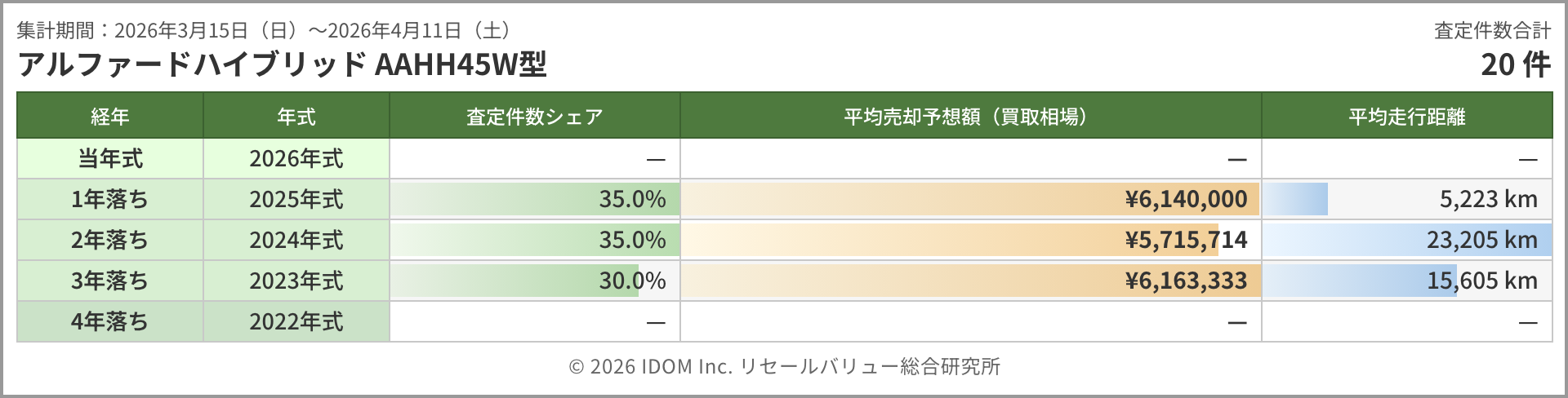 年式別では、1年落ちが約548万円と前回集計の約558万円から約10万円下げた一方、5年落ちは約322万円とほぼ横ばいを維持している。9年落ち(2017年式)は約170万円と前回の約177万円から下げたものの、11年落ち(2015年式)は約171万円で底堅い。12年落ち以降は60〜70万円台で、ここが30系から20系への世代交代ラインとなっている。