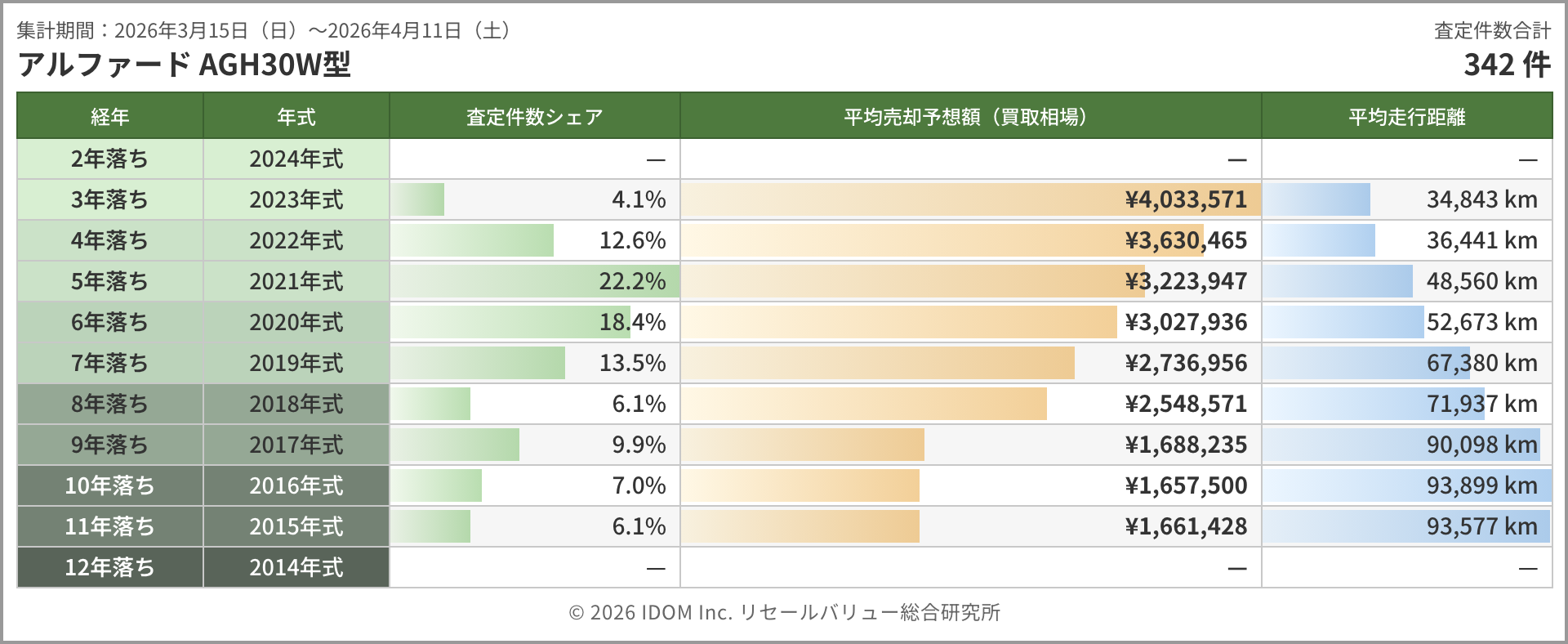 ガソリン車AGH30W型は342件で前回の357件から微減した。ボリュームゾーンの5年落ち(2021年式)は約322万円と前回の約320万円からほぼ横ばいで、安定した水準を保っている。3年落ち(2023年式)は約403万円と前回の約390万円から約14万円上昇しており、30系後期の高年式帯は値崩れしにくい傾向が続く。一方で7年落ち(2019年式)は約274万円と前回の約280万円から下げ、経年に伴うゆるやかな下落が見られる。