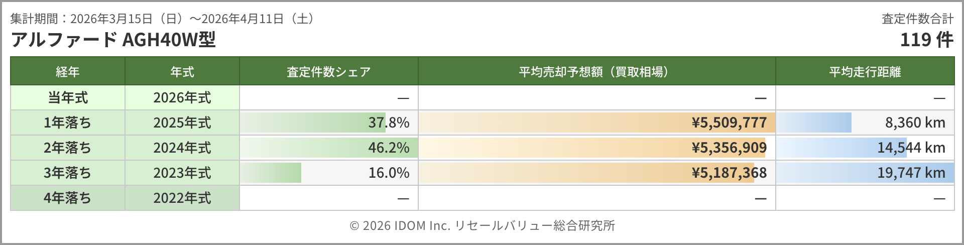 ガソリン車AGH40W型は119件と前回の112件からやや増えた。1年落ち(2025年式)が約551万円、2年落ち(2024年式)が約536万円、3年落ち(2023年式)が約519万円で、前回集計(約560万円・約539万円・約525万円)と比べるといずれも数万円の下げにとどまる。2年落ちのシェアが46.2%と最多を占めており、2024年式の売却が活発であることがわかる。