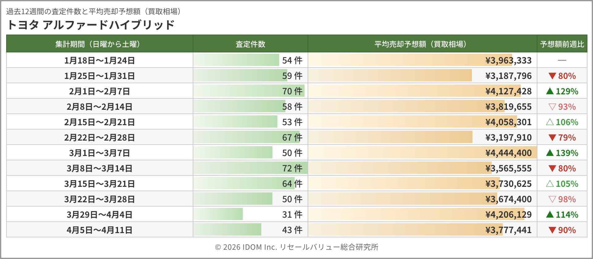 | 過去12週間の査定件数と平均売却予想額(買取相場) | |||