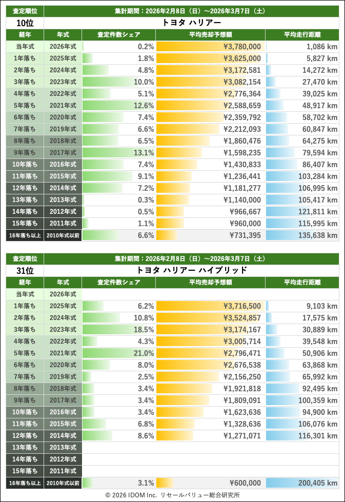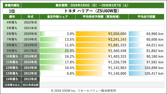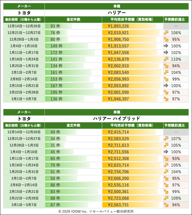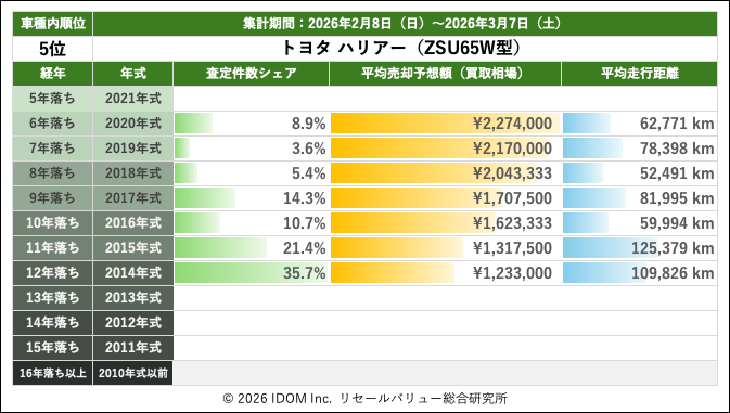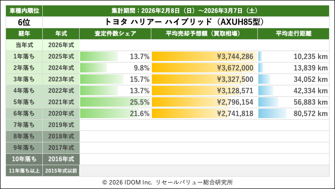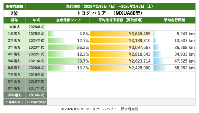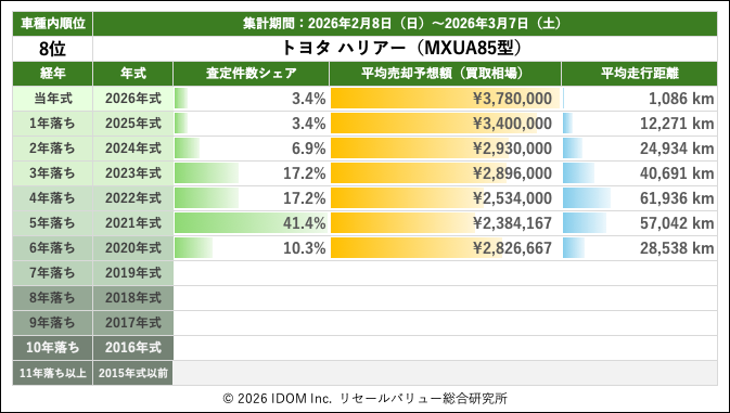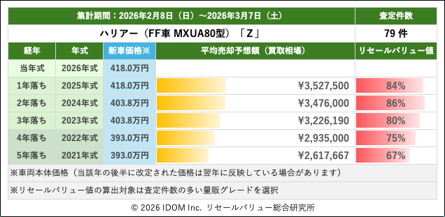 2026年3月7日(土)集計:トヨタ ハリアーの売却予想額(買取相場)リセールバリュー速報