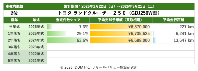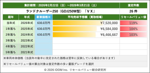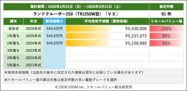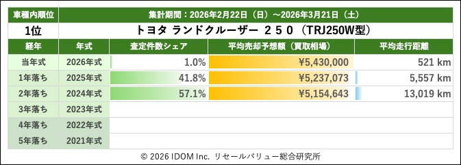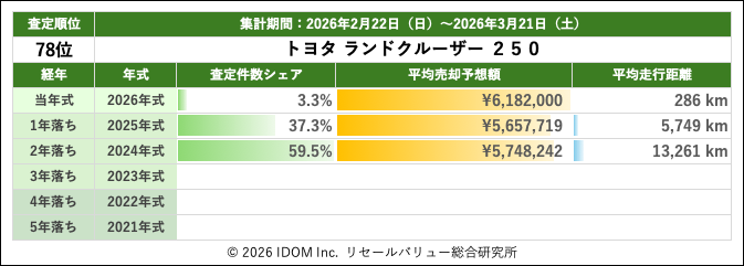 リセールバリュー速報 2026年3月21日(土)集計:トヨタ ランドクルーザー250の売却予想額(買取相場)