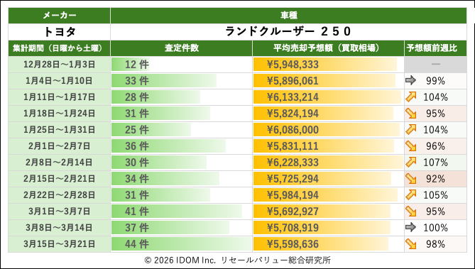トヨタ ランドクルーザー250の買取相場:過去12週間の推移
