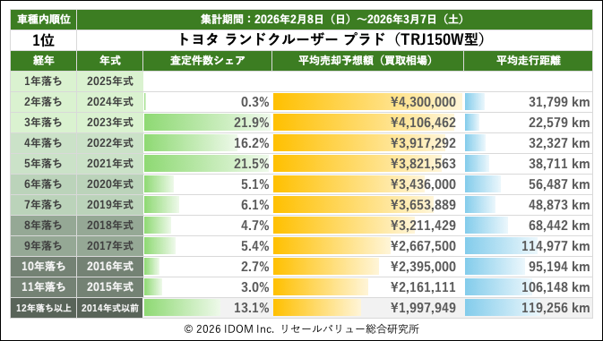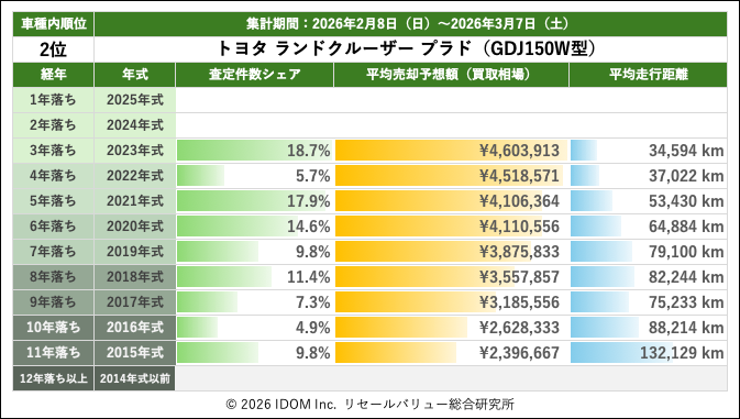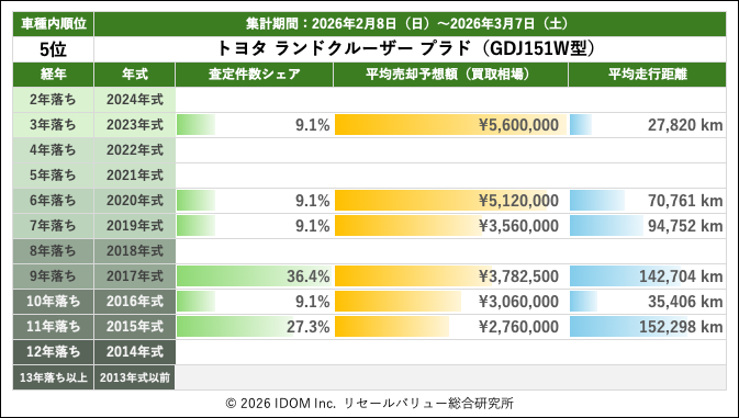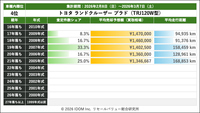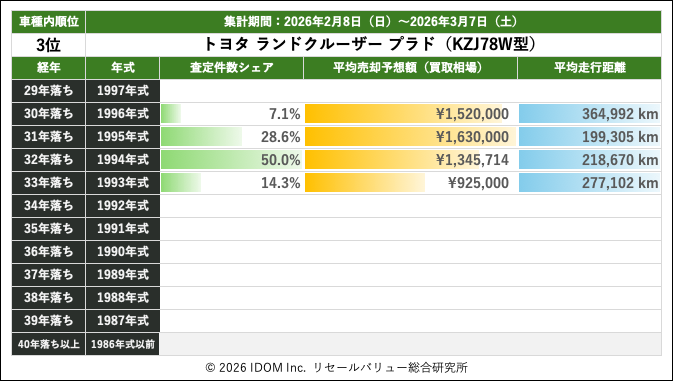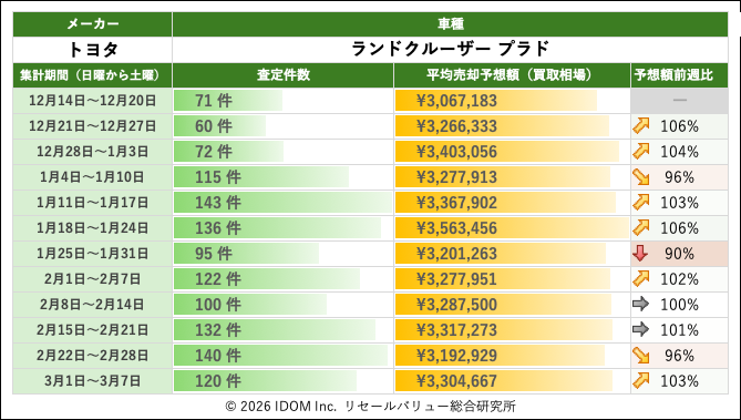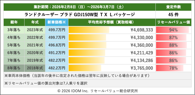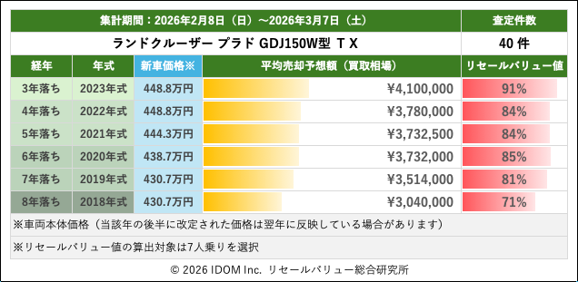 2026年3月7日(土)集計:ランドクルーザープラドの売却予想額(買取相場)リセールバリュー速報