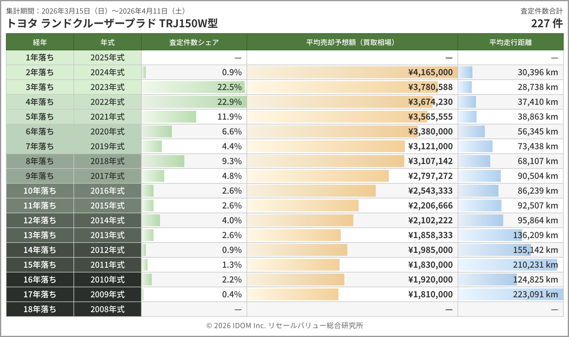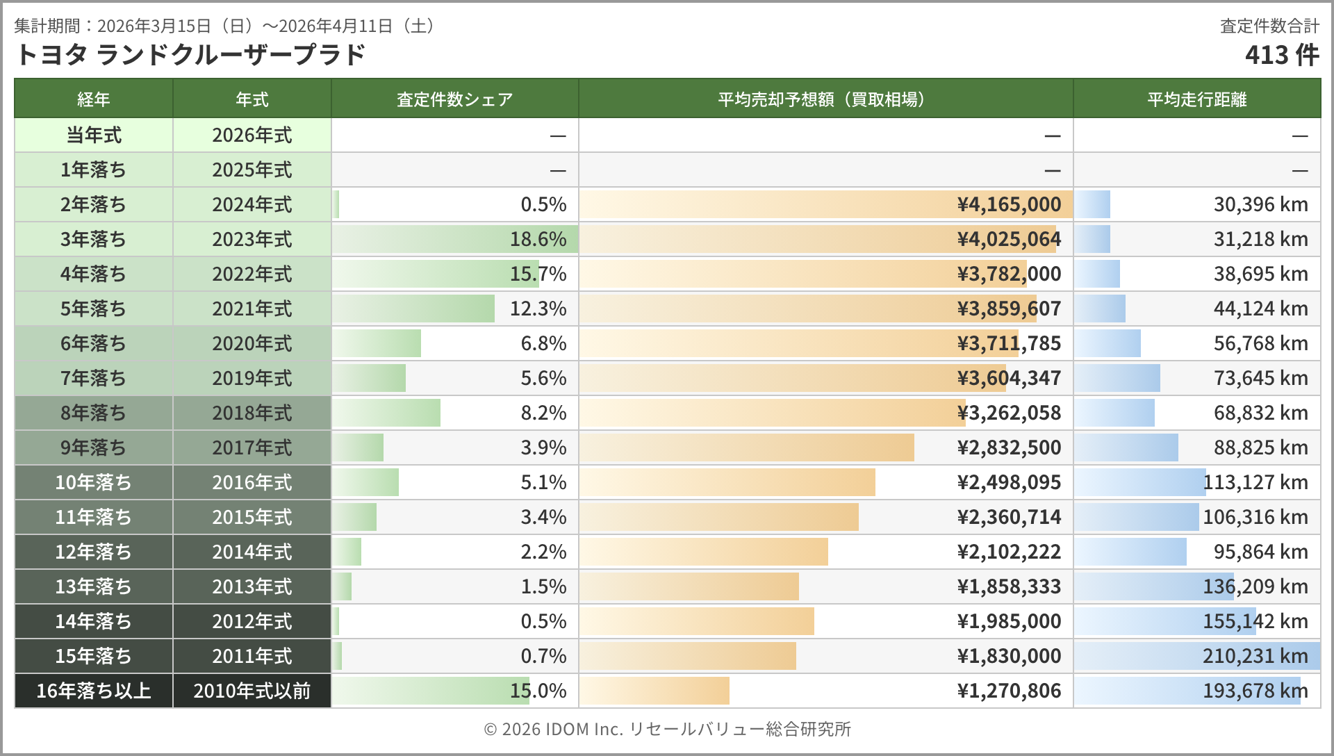 今回集計(3月15日〜4月11日)のランドクルーザープラドは査定件数413件で、前回集計(3月8日〜4月4日)の469件から約12%減少した。一方、相場は全体的に底堅く推移しており、10年落ち以降でも約200万円台を維持する高リセールバリューぶりは健在である。