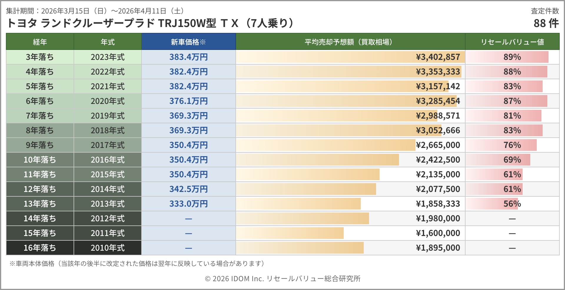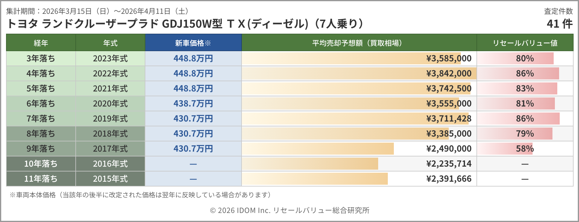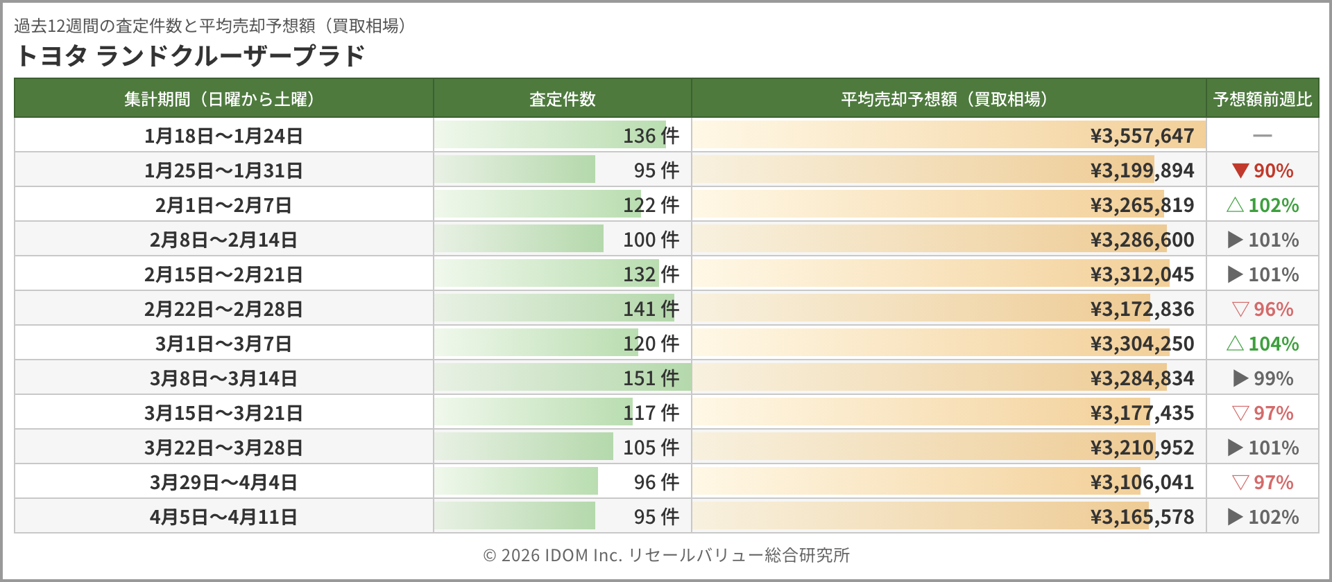 2026年4月11日(土)集計:ランドクルーザープラドの売却予想額(買取相場)リセールバリュー速報