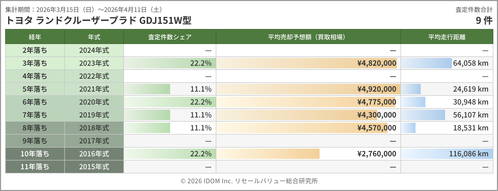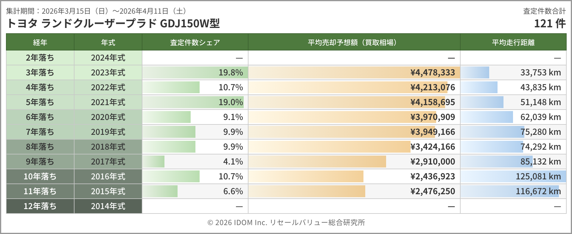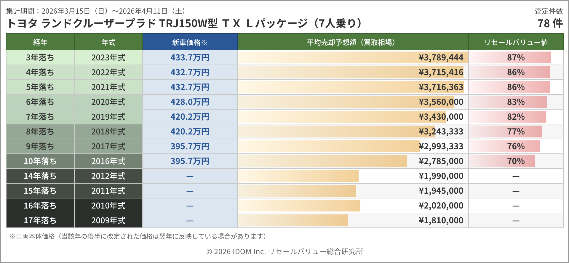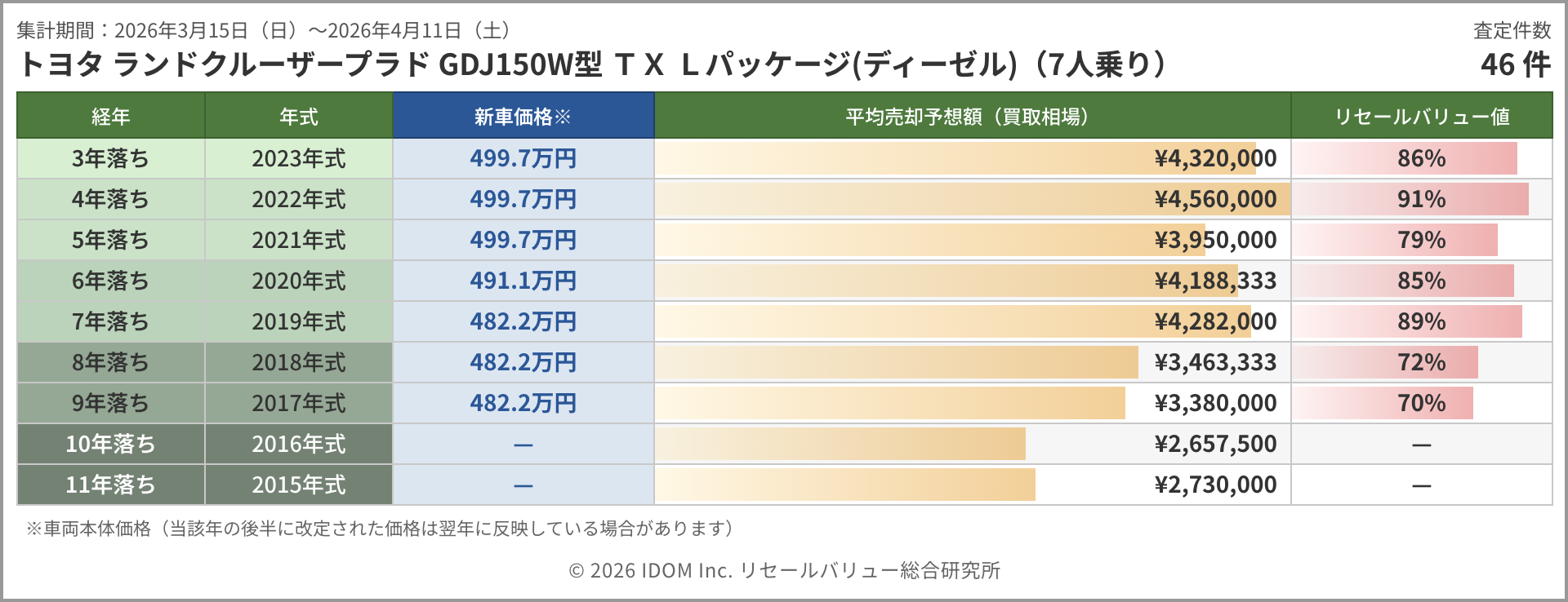2026年4月11日(土)集計:ランドクルーザープラドの売却予想額(買取相場)リセールバリュー速報